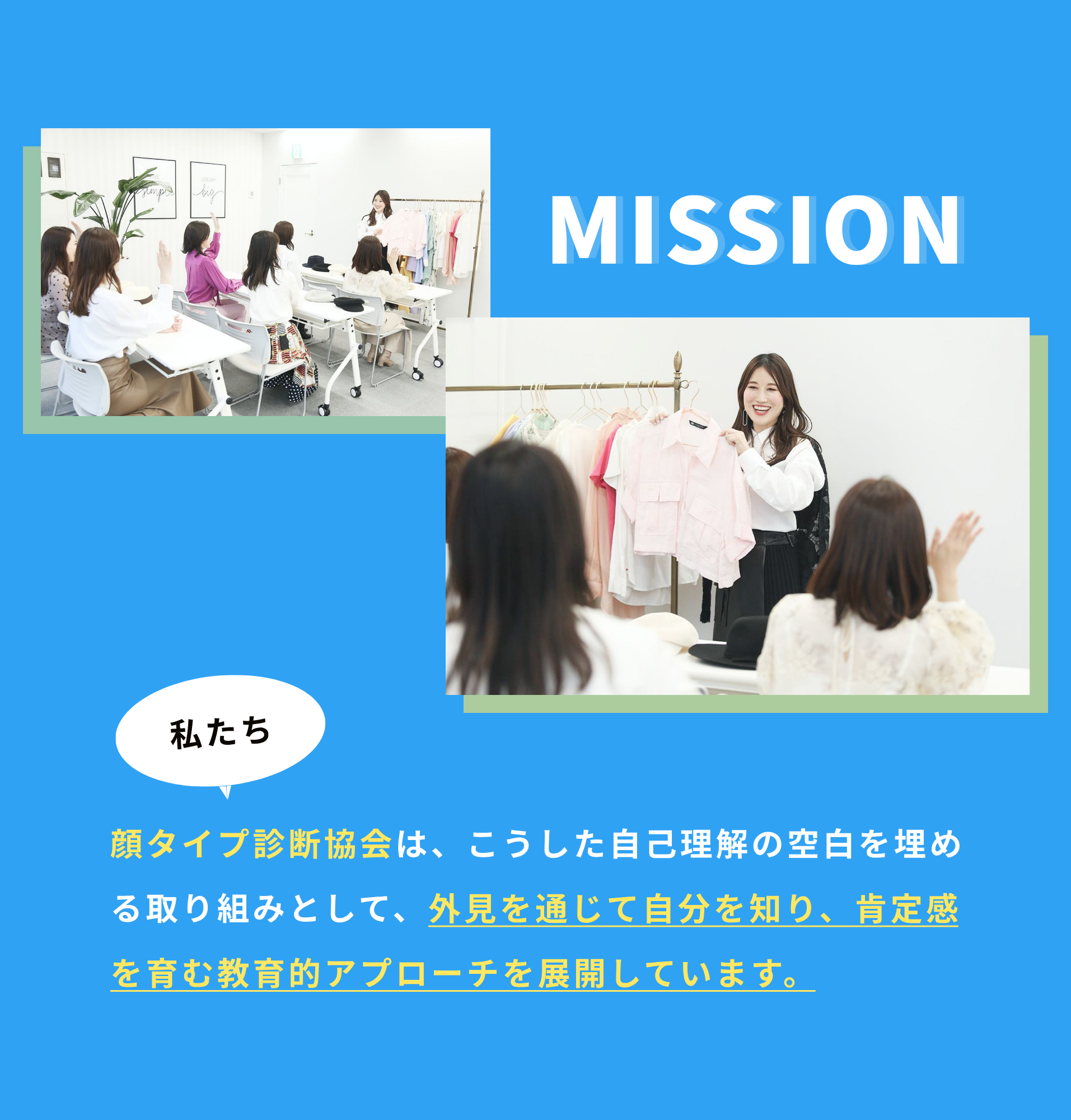 | 活動内容 | ・顔タイプ診断®の提唱・普及 ・顔タイプアドバイザーの育成 ・顔タイプメンズアドバイザーの育成 ・顔タイプヘアデザインマイスターの育成 ・顔タイプ着物アドバイザーの育成 ・顔タイプウェデングアドバイザーの育成 ・似合うメイクアドバイザーの育成 ・骨格診断アドバイザーの育成 ・ パーソナルスタイリストの育成 |